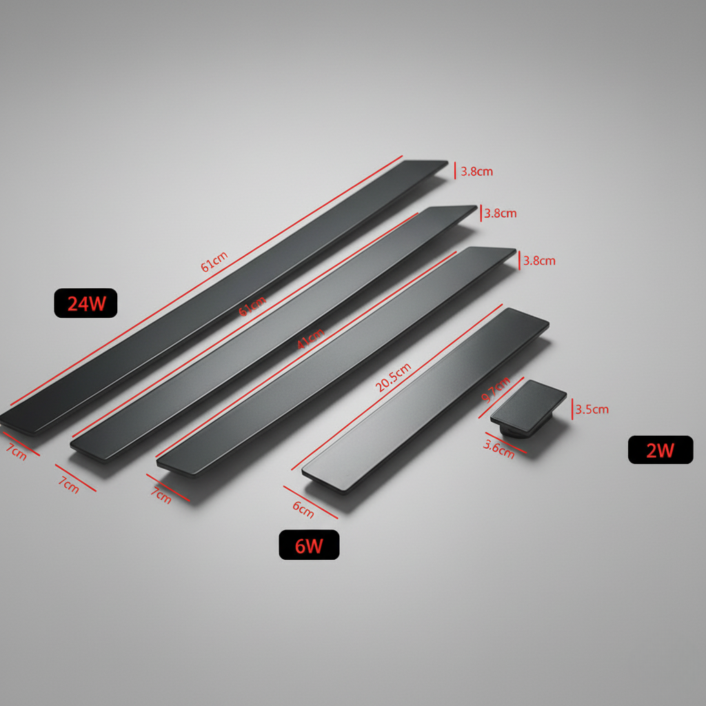 • Sizes: 2W - 5.4 cm x 9.7 cm x 3.5 cm; 6W - 7 cm x 20.5 cm x 3.8 cm; 18W - 7 cm x 41 cm x 3.8 cm; 24W - 7 cm x 61 cm x 3.8 cm